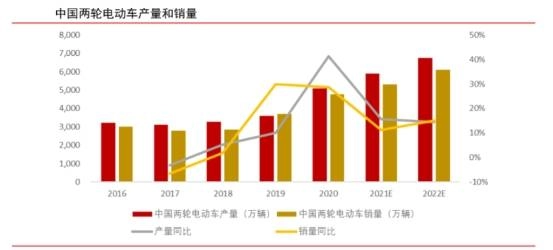根据艾瑞咨询发布的《2021 年中国两轮电动车智能化白皮书》,2016-2020年,我国两轮电动车产量从 3,215万辆增加至5,100万辆;同期,我国两轮电动车销量从3,000万辆增加至4,760万辆,CAGR 为 12.23%。其中,2020年我国两轮电动车产量同比增速高达41.3%,我国两轮电动车销量同比增速为28.6%,主要系因为国内各地新国标过渡期限临近,两轮电动车市场上超标两轮车的更新替换需求高涨。中期来看,我国两轮电动车未来将保持稳定增长。一方面,2021 年起,超标两轮电动车将正式迎来大量清退替换,替换需求将继续推高中国两轮电动车的产销量;另一方面,随着共享电动自行车运营规范化程度提升,哈罗、美团等平台有望加大共享电动自行车的投放量。艾瑞咨询预计,2022年我国两轮电动车销量将达到 6,100 万辆。